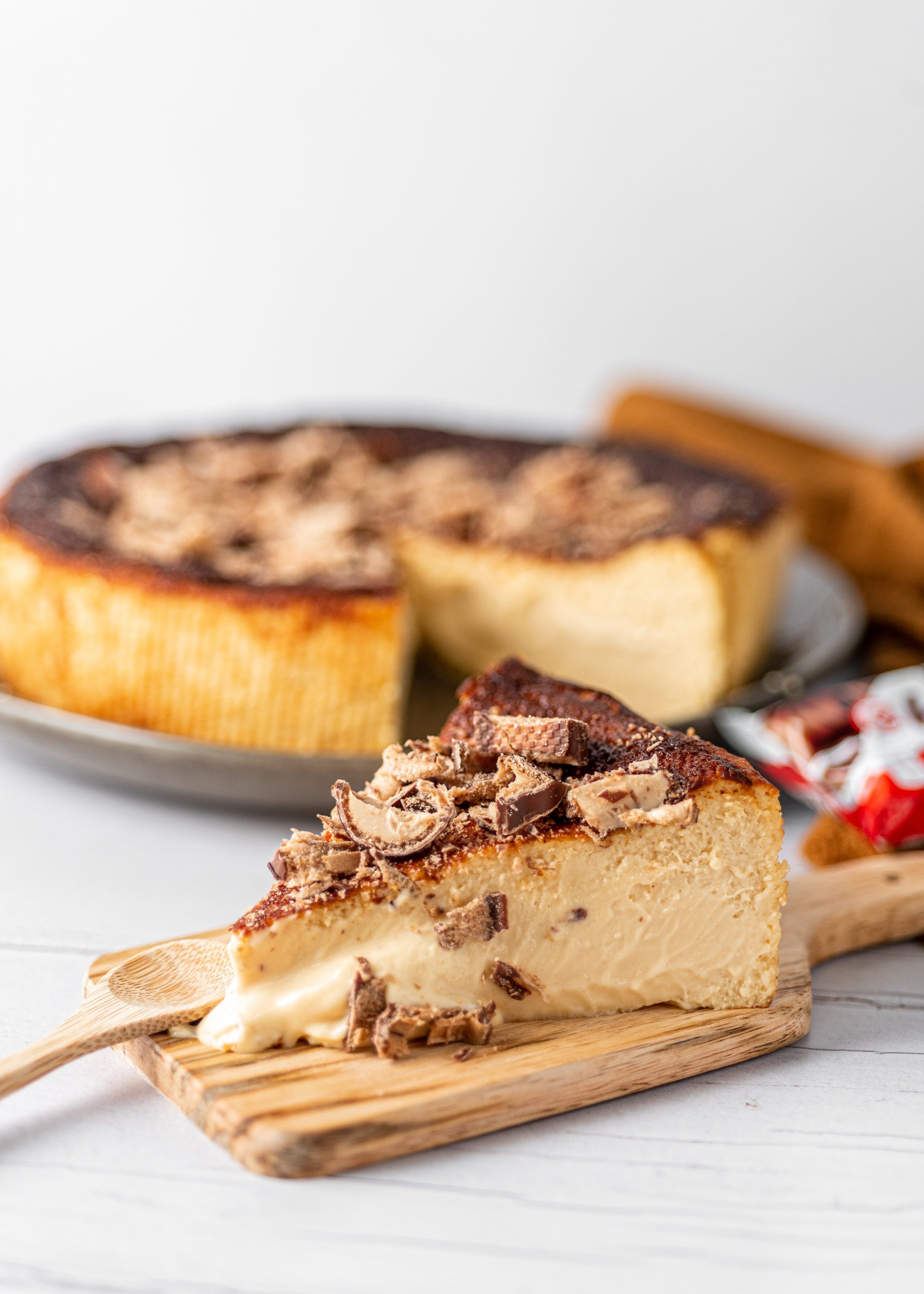 Baked cheesecake topped with authentic cream and pieces of Kinder Bueno. Truly delicious.